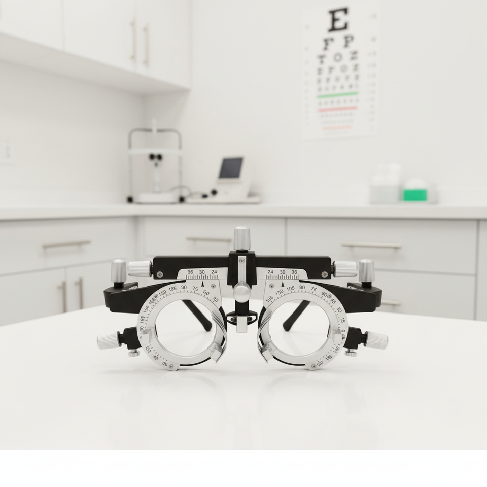 Monture d'essai réglable avec supports de lentilles multiples, design léger et ajustement PD pour examens ophtalmologiques et réfraction de précision