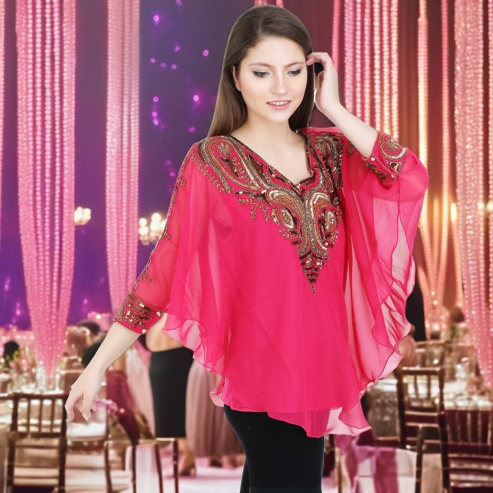 2025 Elegant Short Georgette Kaftan Dress Top Women Free Size Adt Party Wedding Night Club Wear Heavy Beads Embroidery Indian