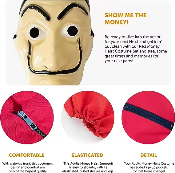 Adults Unisex Bank Robber Fancy Dress Costume Red Jump Suit With Hood Costumes TV & Movie Show Fancy Dress
