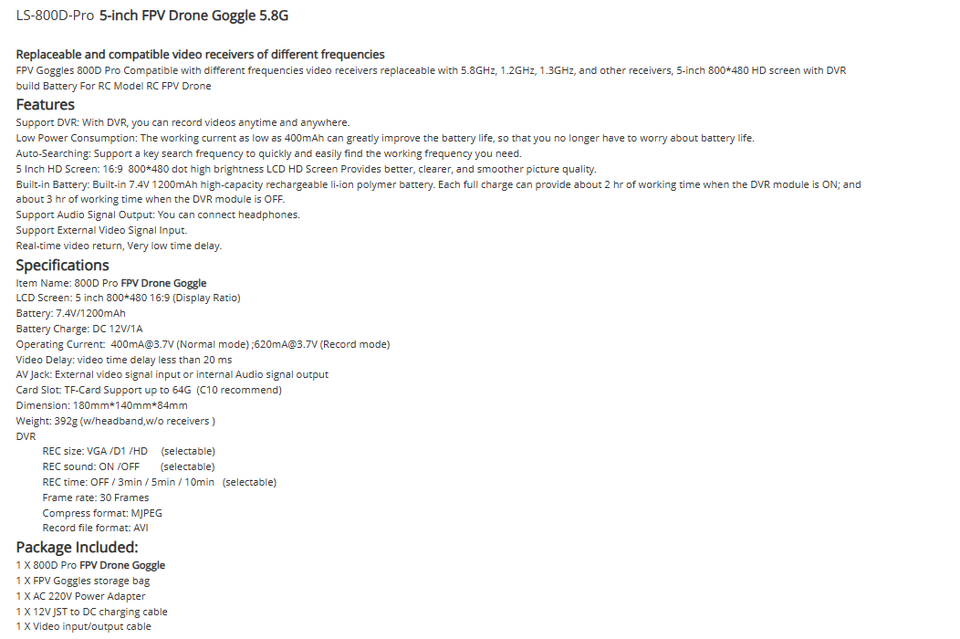 Lunettes FPV 5.8G 800D PRO avancées avec écran 5 pouces, batterie remplaçable et enregistrement vidéo pour hélicoptère RC