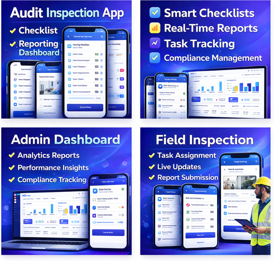 Application mobile d'inspection et d'audit avancée avec tableau de bord pour le personnel et les administrateurs, rapports en temps réel, suivi des tâches et gestion de la conformité