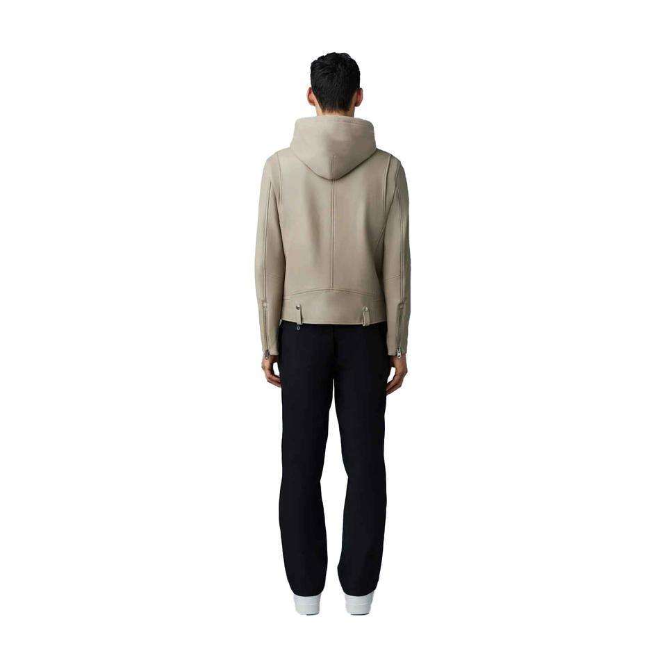 Blouson en cuir pour homme de qualité supérieure, en cuir véritable et toile, style moto et motard, avec capuche et logo personnalisé sur le devant, idéal pour l'hiver.