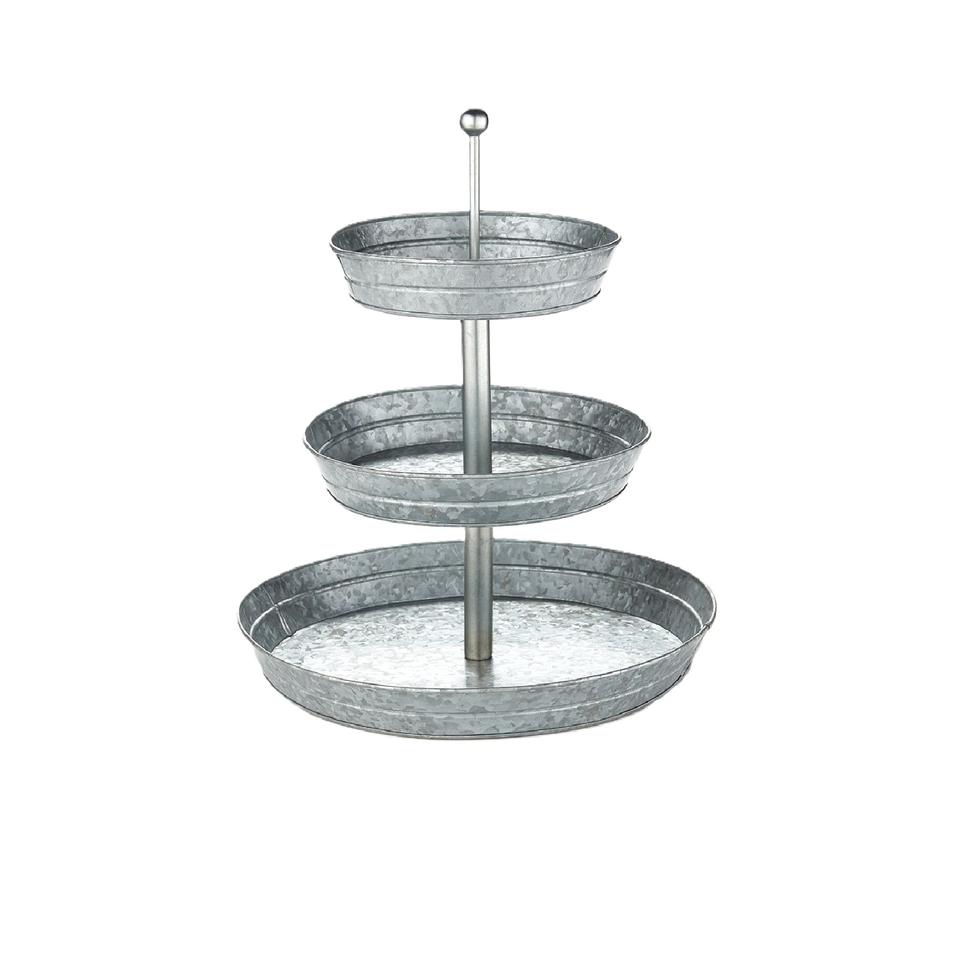 Plateau de service décoratif rond à 3 niveaux au design avantageux, noir et gris, style ferme, avec poignée en bois pour présentation de desserts