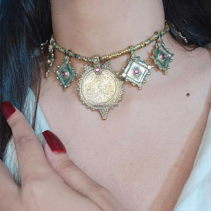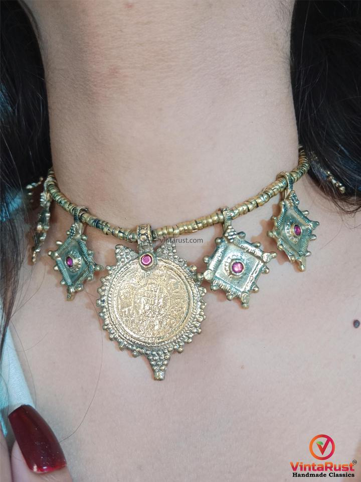 Ensemble de bijoux afghans Kuchi en cuivre fait à la main Boho Design géométrique traditionnel Pièces de monnaie vintage Look unique Colliers de perles de mode