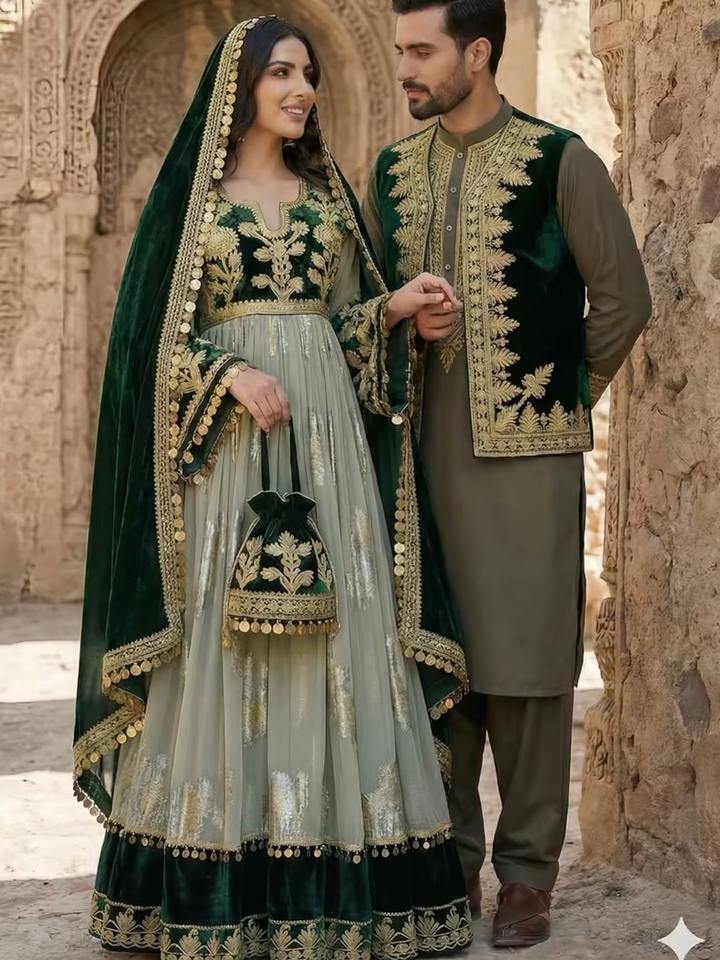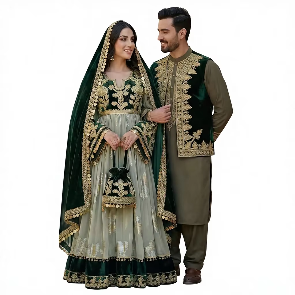 Afghan Vintage Bohemian Traditional Pashtun Couple Dress Handmade Ethnic Cultural Wedding Clothing Customizable Floor Length
