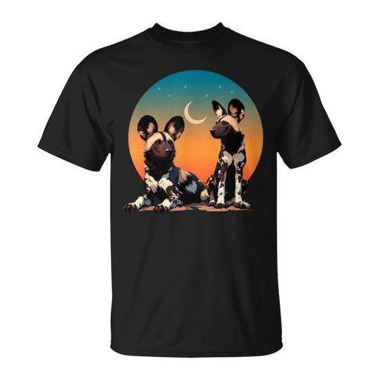T-shirt avec chiens sauvages africains peints au coucher du soleil et à la lune pour les amoureux de la faune
