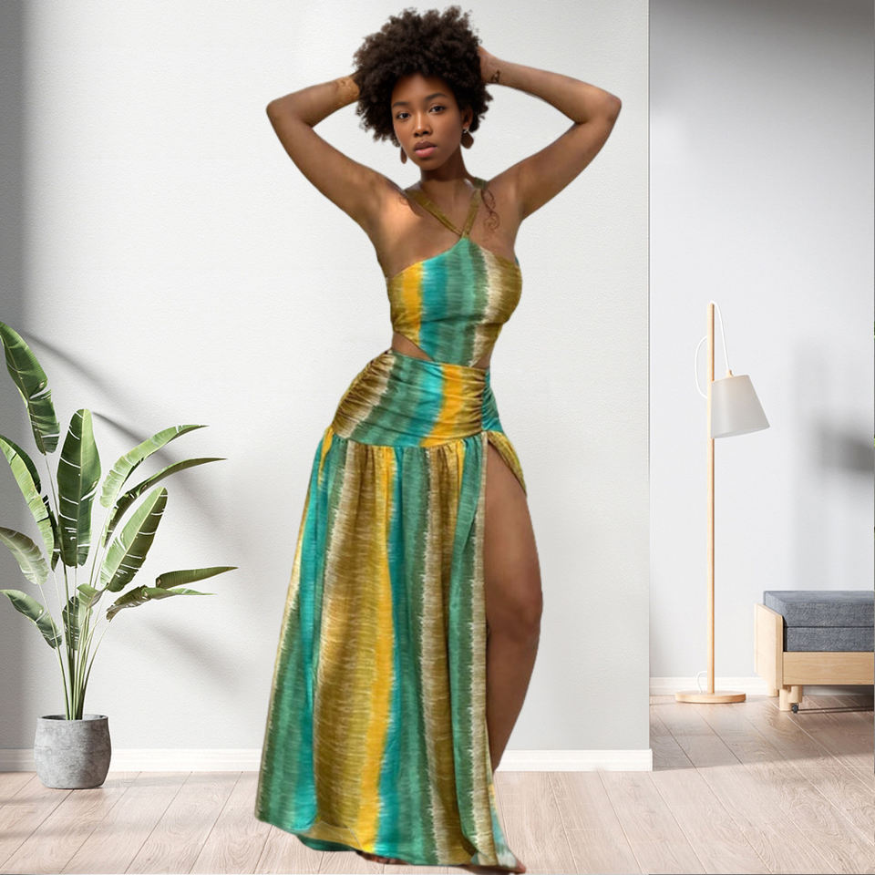 Robe longue africaine sexy à contraste de couleurs, dos nu, à volants et fente, pour femme, tendance