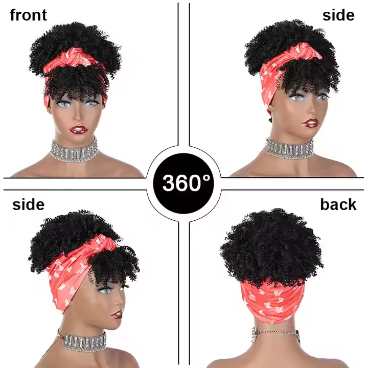 Afro Kinky Curly Headband Wig with Bangs Turban Wig High Puff DesignAdjustable Drawstring Perfect for Music Festivals & Cosplay