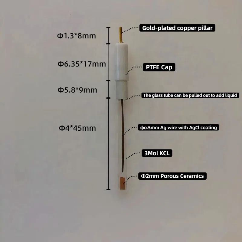 Matériel:Tube en verre + fil d'Ag avec revêtement AgCl + PTFE + pointe en céramique poreuse + KCl 3 mol