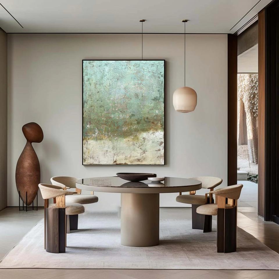 Peinture abstraite vert rustique vieilli sur toile pour la décoration intérieure – Peinture à l'huile originale faite à la main, tableau mural moderne