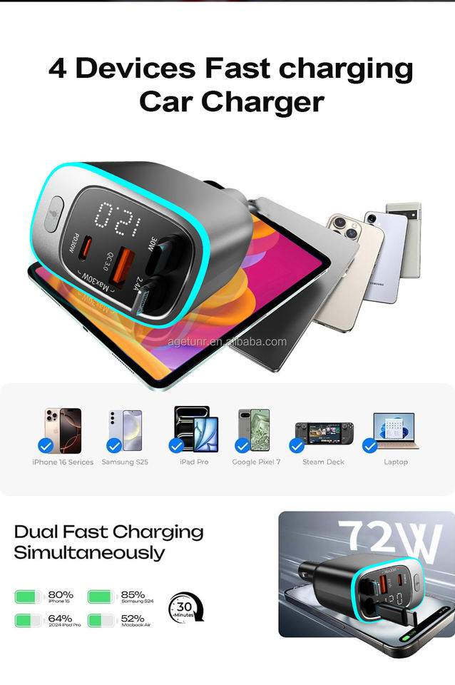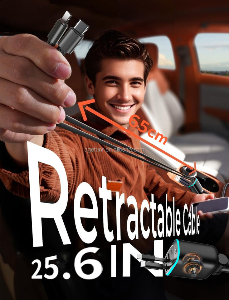 Agetunr Hot A19 Chargeur portable rétractable 6 en 1 avec câble de 65 cm, 2 ports PD Type C 30W+QC3.0 18W+12W, chargeur allume-cigare pour voiture Lightning
