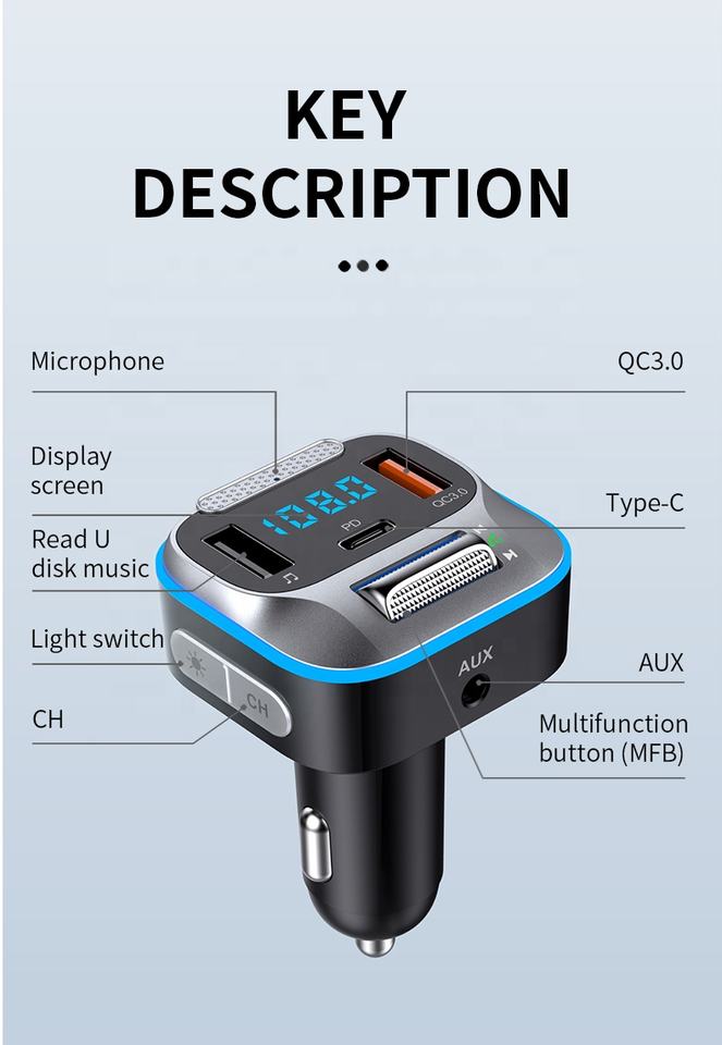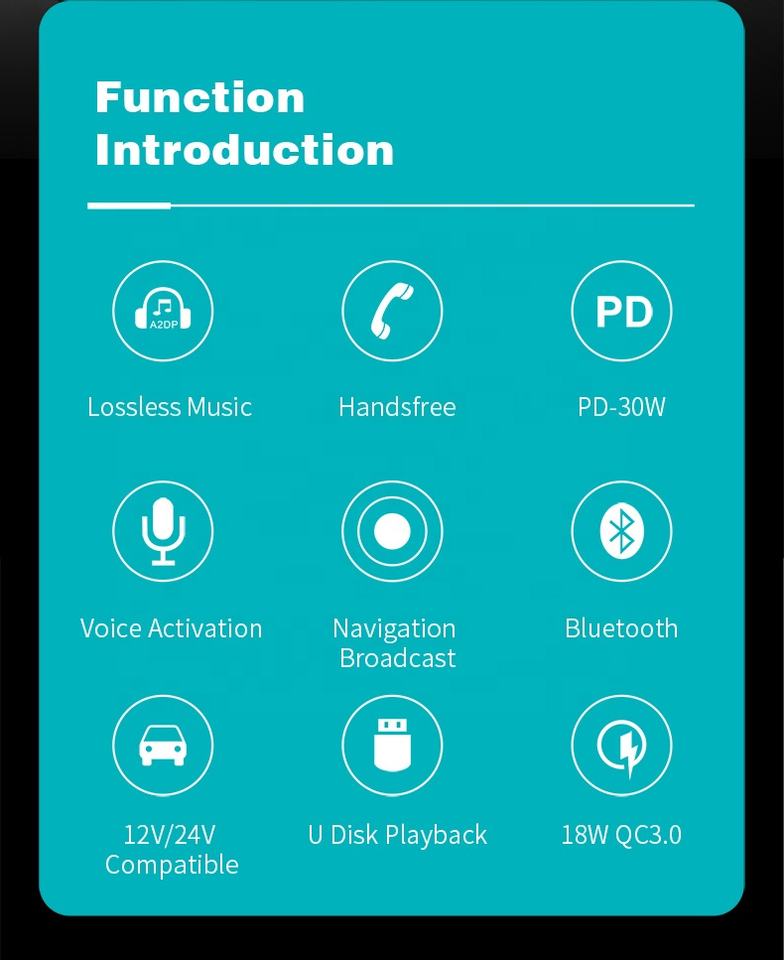 Stéréo, Chargeur de Voiture, Lecture, Transmetteur fm, Mains-libre, Haut-parleur intégré, Charge rapide, Lumières colorées, Microphone intégré, L'assistant vocal, Écran d'affichage, Mémoire de Mise Hors tensionFonction