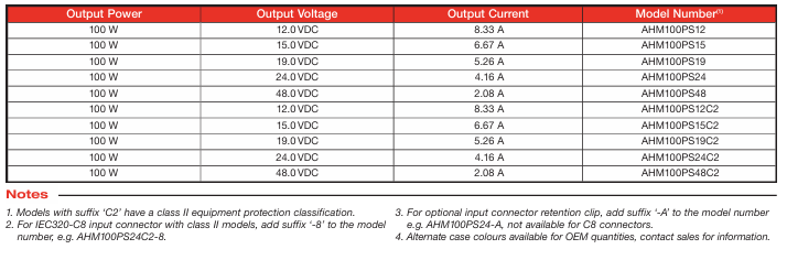 Ahm100PS12 Adaptateur secteur pour bureau 100W 12V 8.33A, 4 broches, 80 ~ 264 Vacin