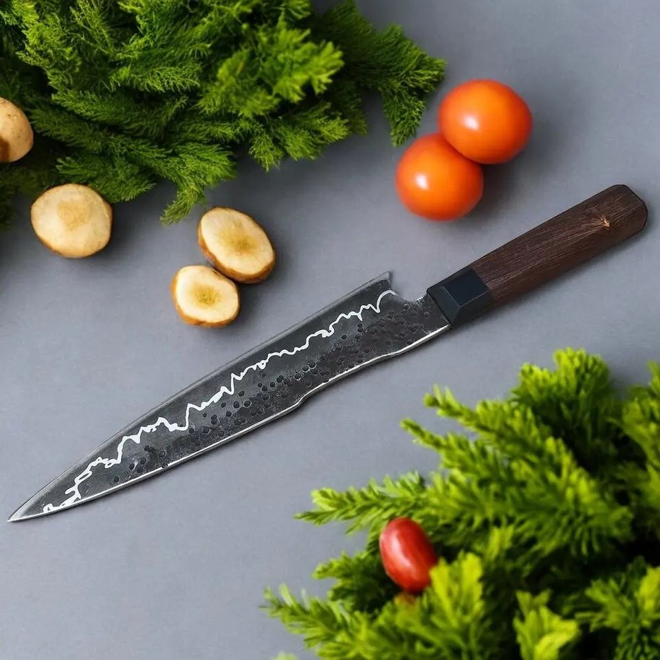 Couteau de chef artisanal en acier carbone de 13 pouces, fabriqué sur mesure par Ahmad Fabric, avec étui en cuir, manche élégant, personnalisable.