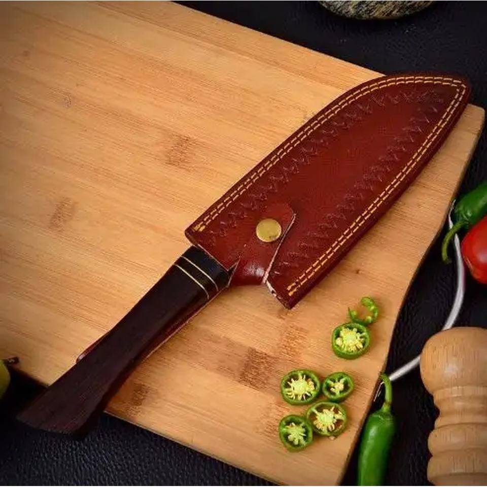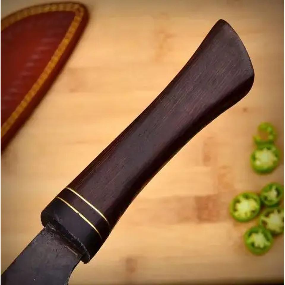 Couteau de chef artisanal en acier carbone de 13 pouces, fabriqué sur mesure par Ahmad Fabric, avec étui en cuir, manche élégant, personnalisable, qualité industrielle OEM.