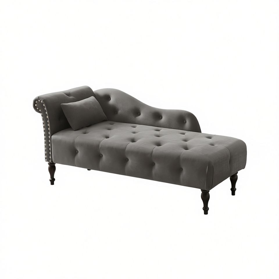 Chaise longue Aijia 60,6 pouces en velours gris avec boutons capitonnés, garniture cloutée, pieds en bois massif, design bras gauche