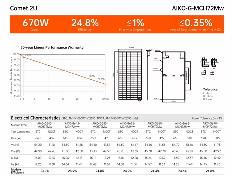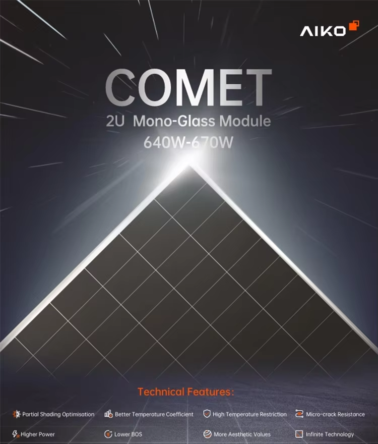 Aiko 2U ABC Cellule N-Type Mono Glass 640W 645W 650W 655W 660W 665W 670W Panneaux solaires 24.1%