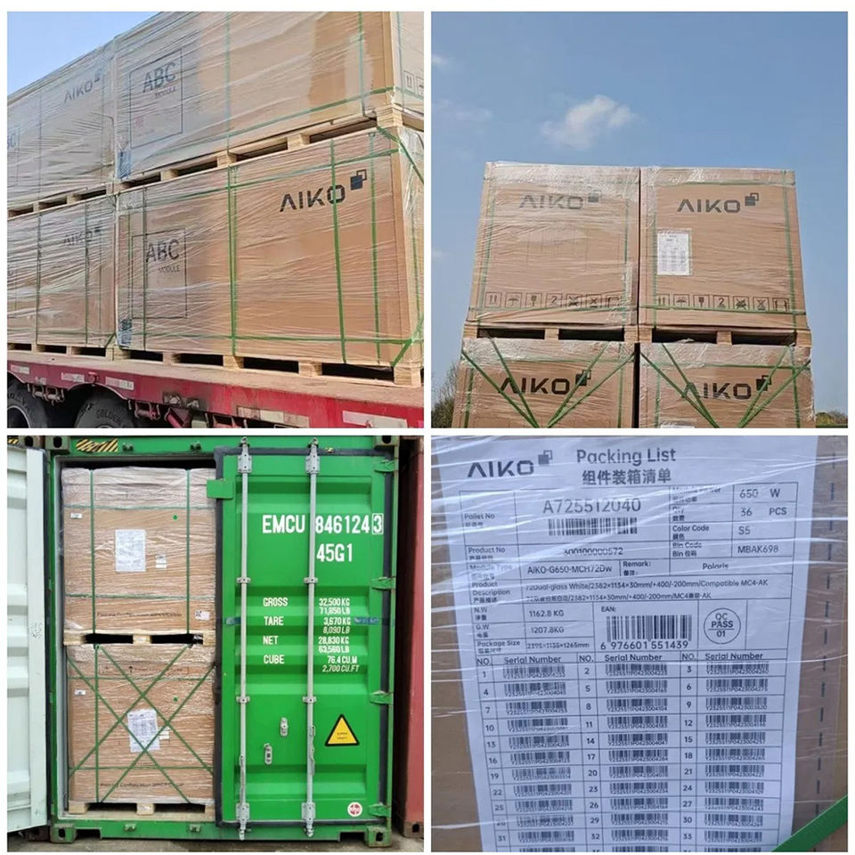 Panneaux solaires Aiko de type N ABC 640W 645W 650W 655W 660 Watt 665 Watt 670 Watts, panneaux bifaciaux à double vitrage de type N pour l'électricité