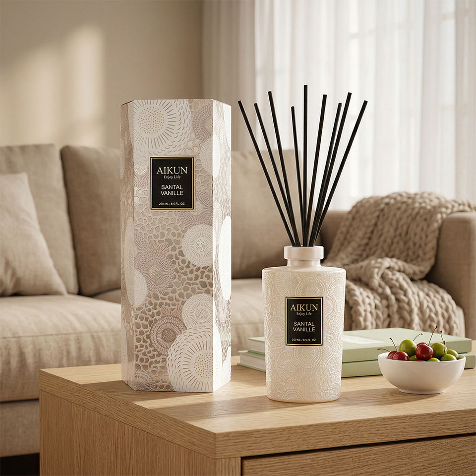 Diffuseur de parfum Santal Vanille Aikun Tall Box Private Label en verre givré carré de 250 ml IP12 pour la décoration du salon