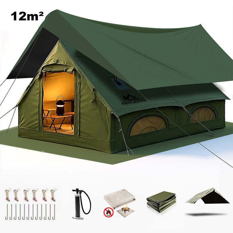 Tente Gonflable 12 Oxford Imperméable Quatre Saisons avec Fond PVC, Fenêtre Panoramique, Protection Solaire, pour Plage et Camping, Double Couche, Anti-UV 3000mm+, Montage Rapide