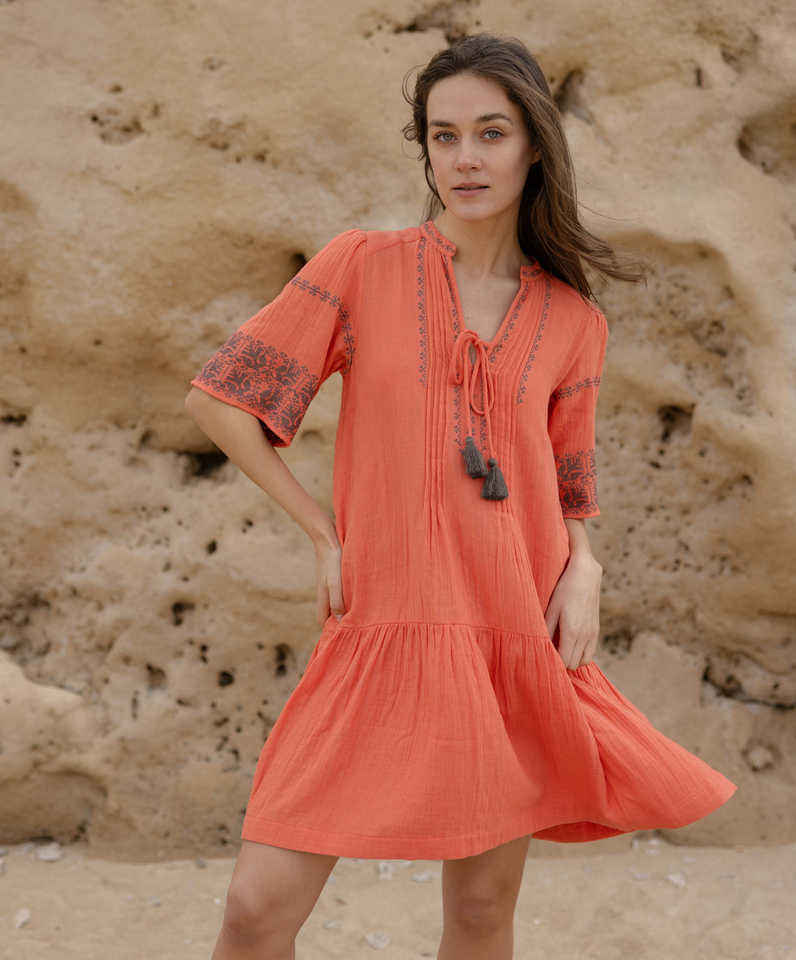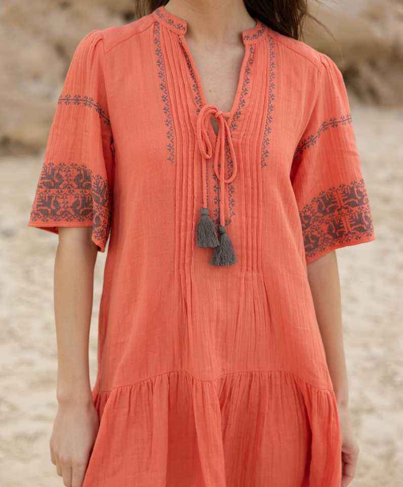 Ajaccio Dress Feminine Charm Intricate Contrast Color Embroidery Fine Pin-Tuck Detailing Delicate Striking Natural Waistline
