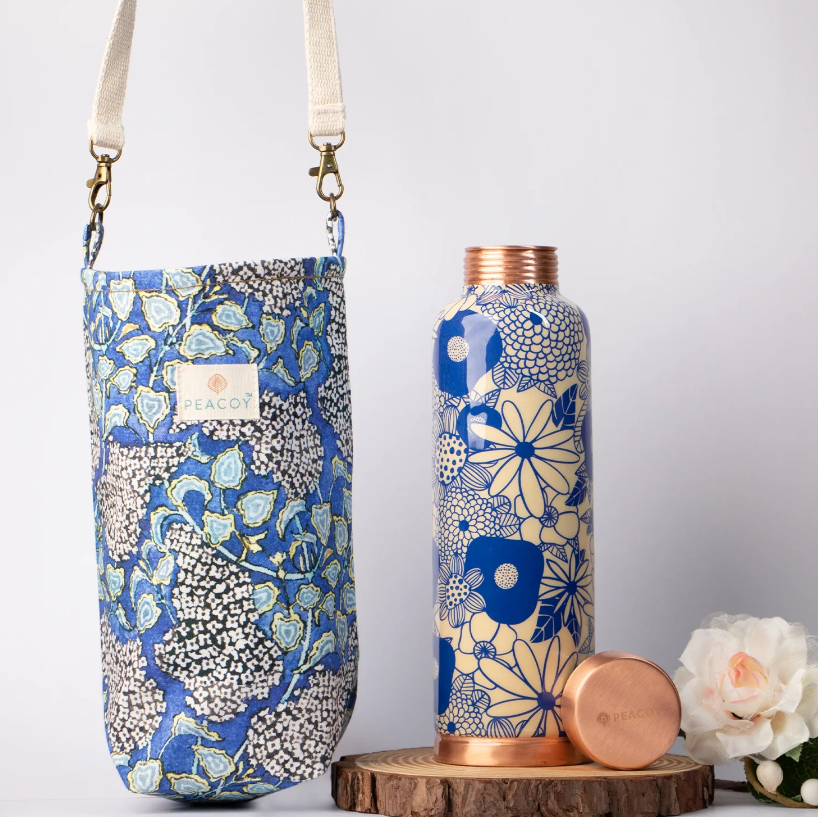 Bouteille en cuivre imprimée avec motif Rajwada en laiton Ak avec sac