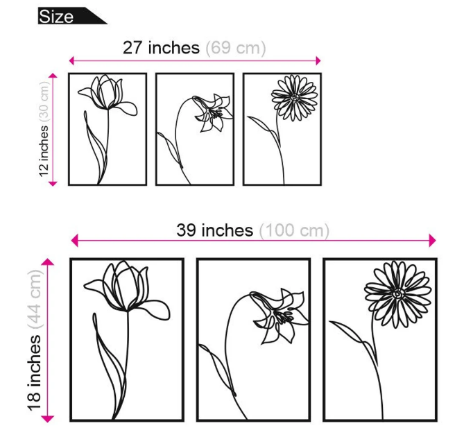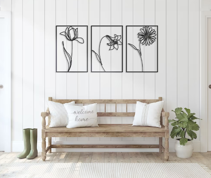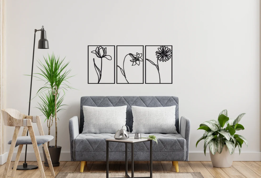 Ak – décoration murale en laiton noir à 3 panneaux, Design de fleurs et Art mural en métal
