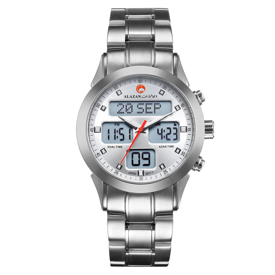 Montre Bâtie Acier Inoxydable «Al Fajr» Musulmane Islamique, Double Heure, Azan, Boussole Qibla, Étanche, Horloge Usine LED LCD