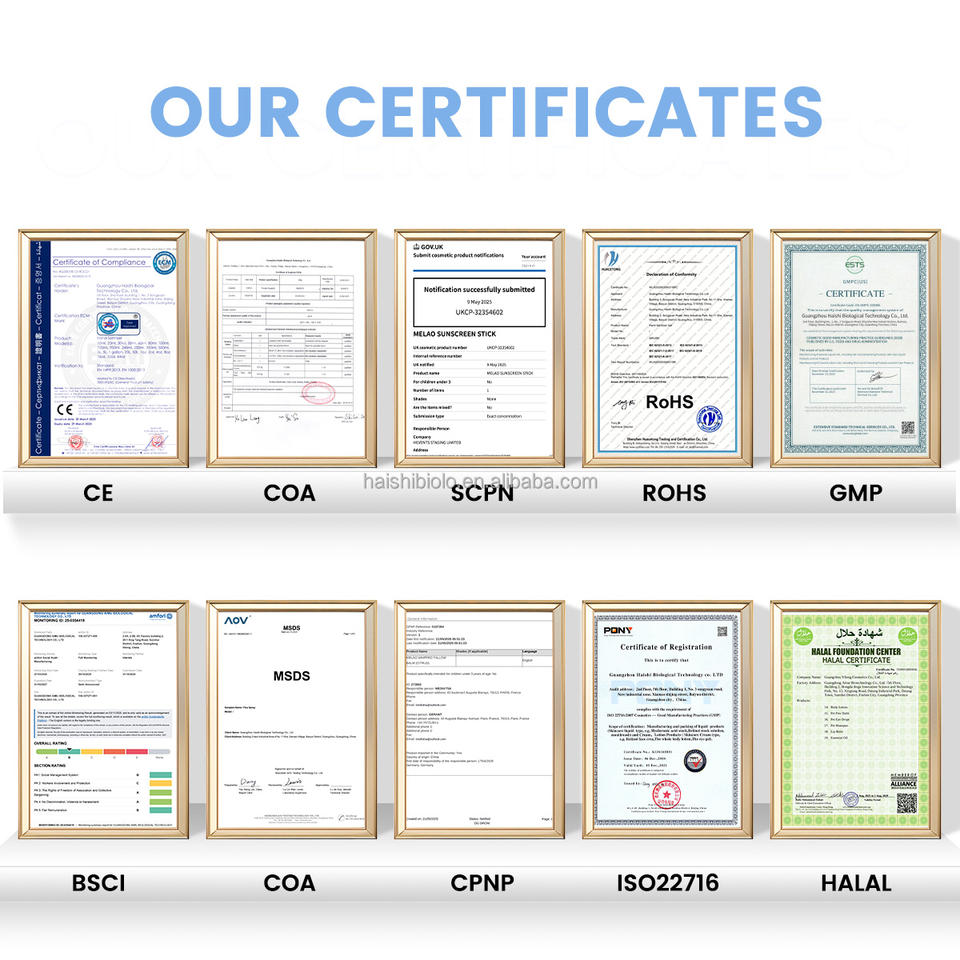 Certificats:CPNP SCNP BPF COA FDS CPSR ISO22716