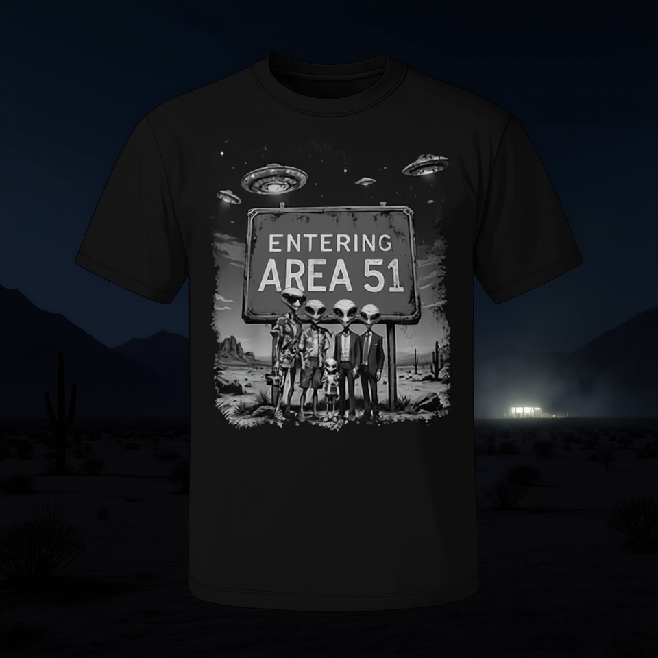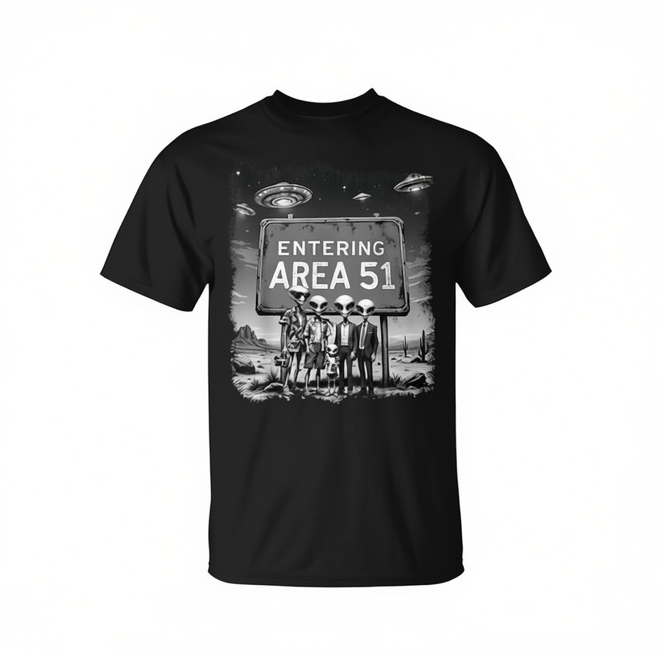 T-shirt avec photo de groupe d'aliens entrant dans la zone 51 Ufo