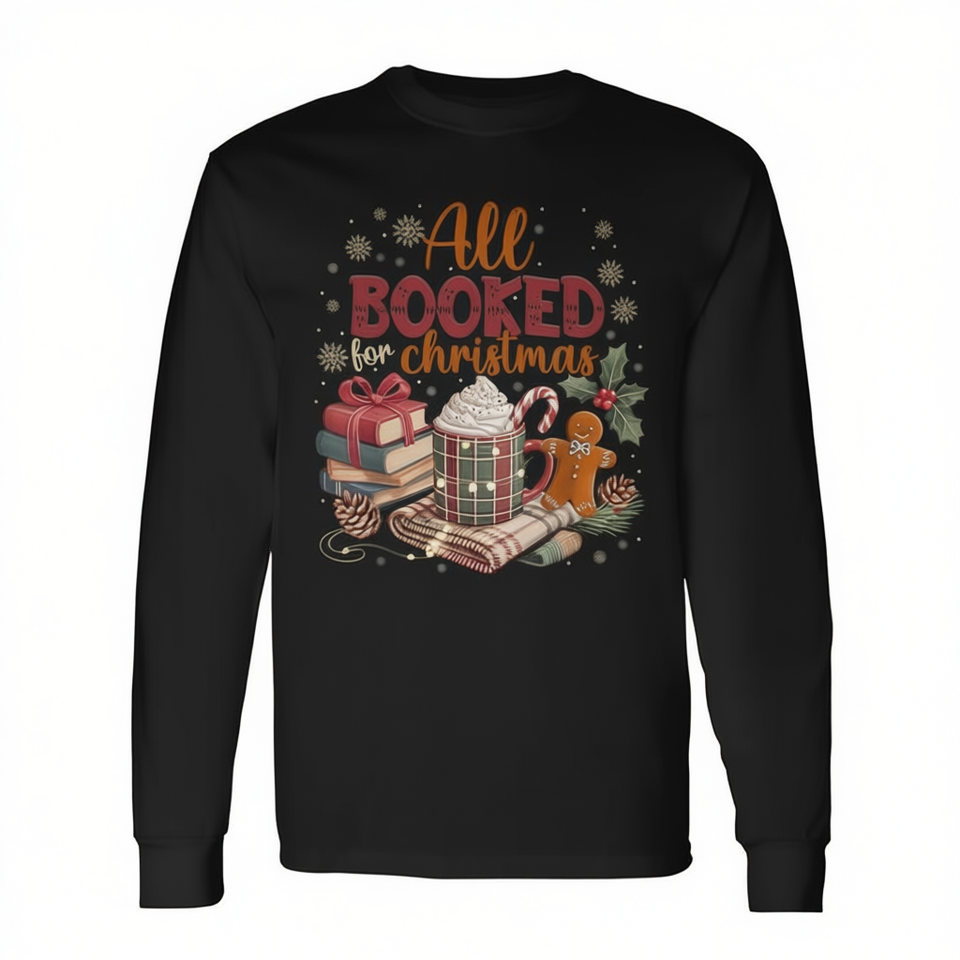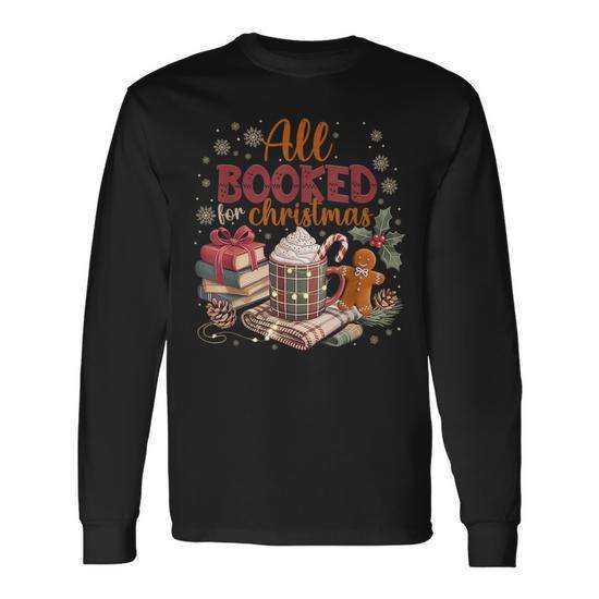 T-shirt à manches longues « All Booked For Christmas » avec motif de livres et de chocolat, idéal pour les cadeaux de Noël