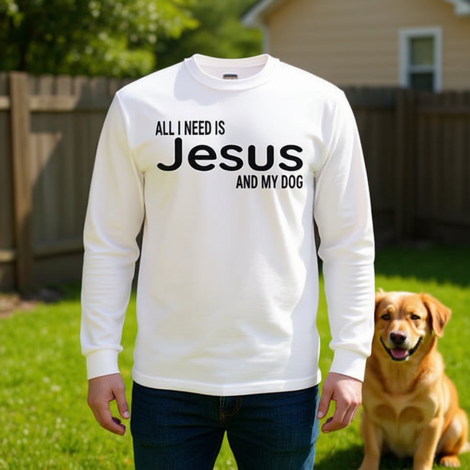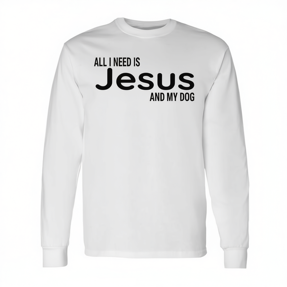 T-shirt à manches longues avec col rond en coton pour adulte, design de foi chrétienne, tout ce dont j'ai besoin, c'est Jésus et mon chien, unisexe