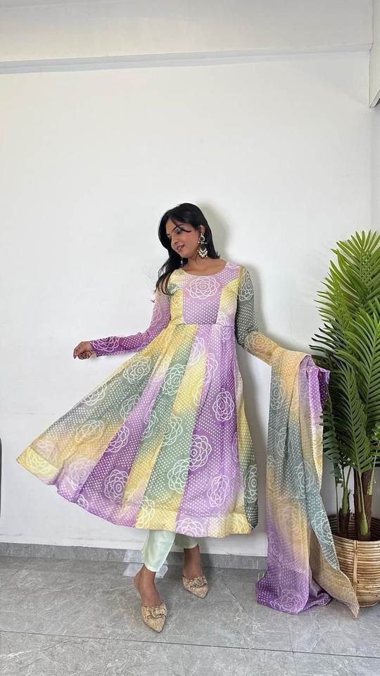 All-New Anarkali Suit Pure Soft Lightweight Organza Bandhej Fabric Micro Cotton Inner Kali Cut Attached Canvas Patta for Parties