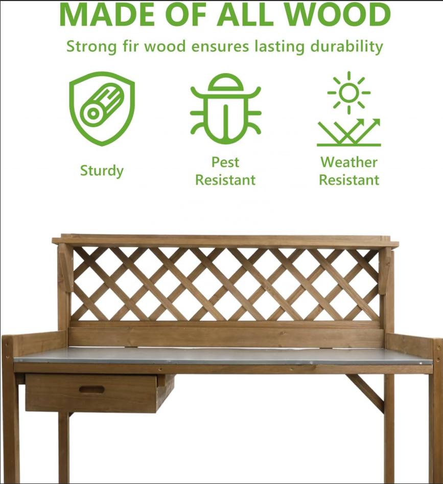 Table de jardin en bois résistante aux intempéries avec crochets latéraux, poste de travail extérieur pour jardinage