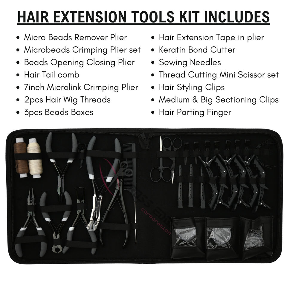 Kit d'outils tout-en-un pour extensions de cheveux noirs avec pince à bandes adhésives, outil de retrait de micro-perles, outil de sertissage de 7 pouces, mini-ciseaux et pinces de coiffage