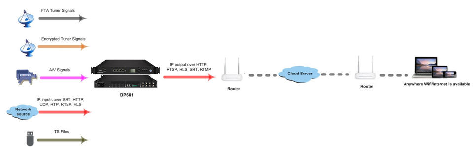 SRT HTTP HTTPS UDP RTP RTSP et HLS pour les besoins, sortie RF pour les besoins
