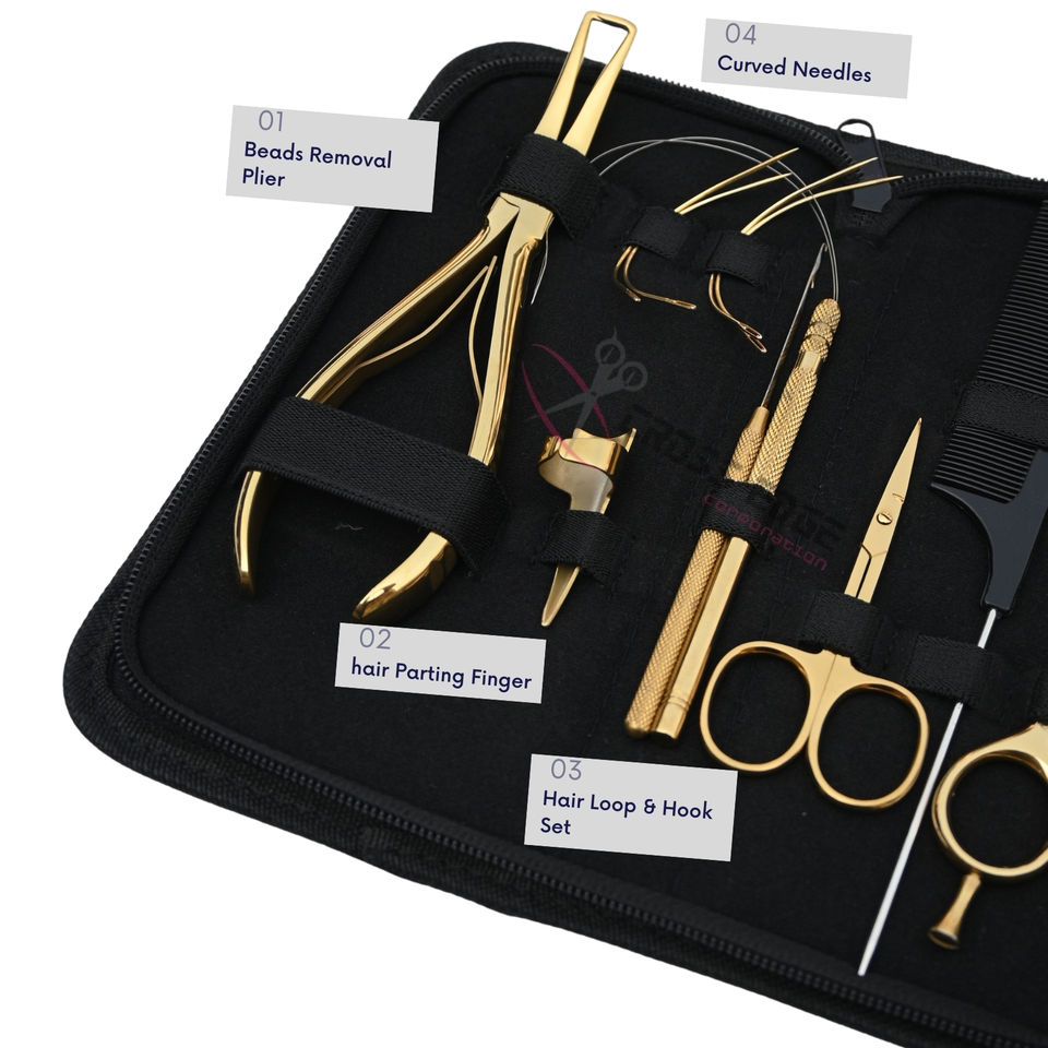 Kit d'outils tout-en-un pour extensions capillaires dorées avec pince de retrait de micro-perles, crochets de micro-liaisons, enfileurs de fils et accessoires de salon