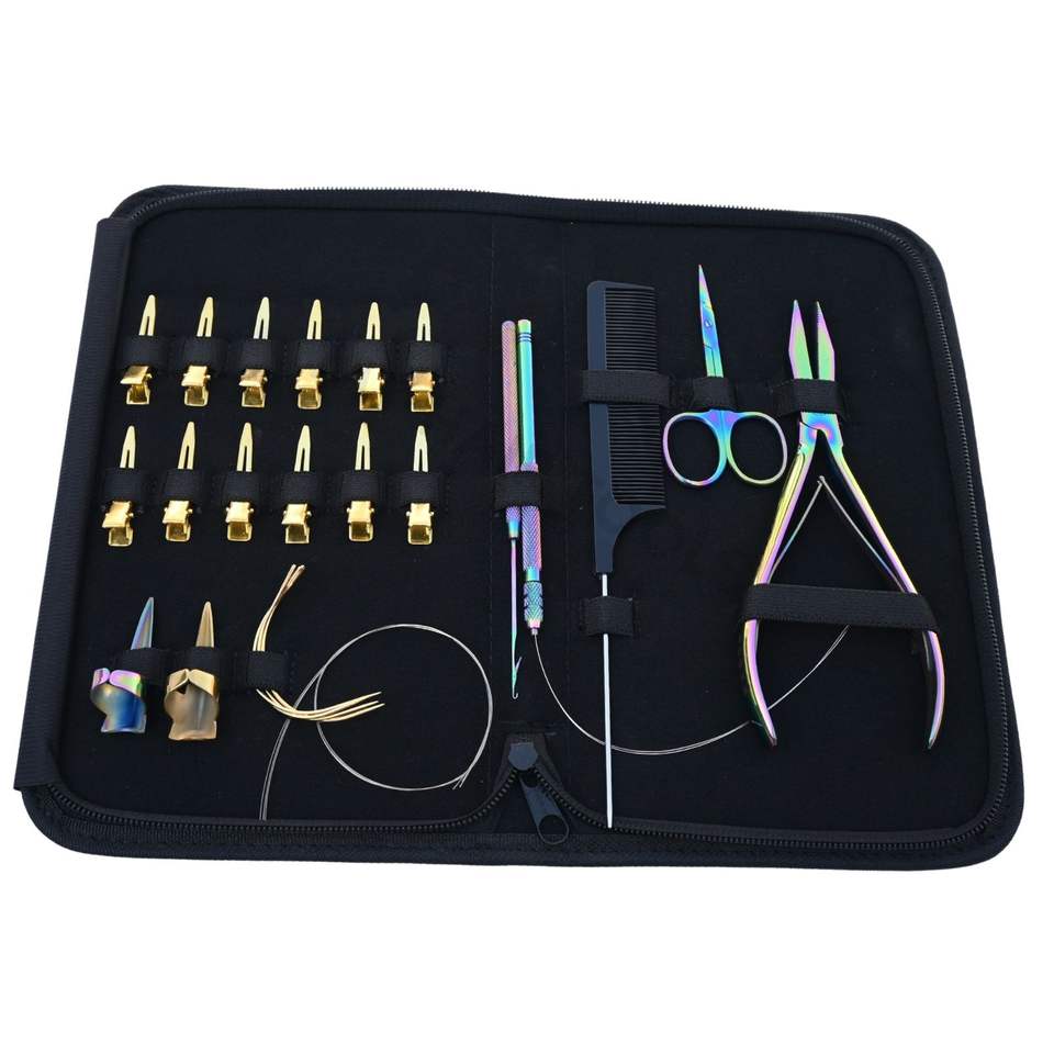 All-in-One Hair Extension tool Kit with Flat Bead Crimping plier Hair Pulling Hook Curved Stitching Needles & Sectioning clips