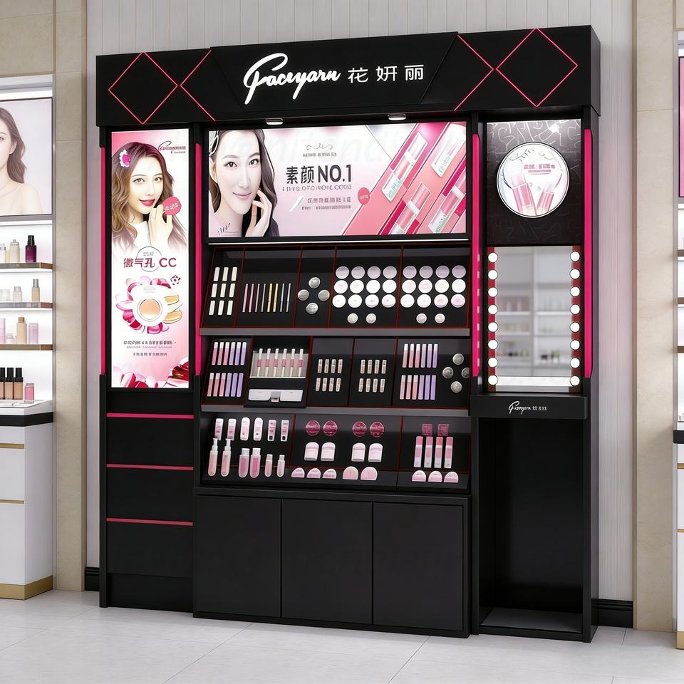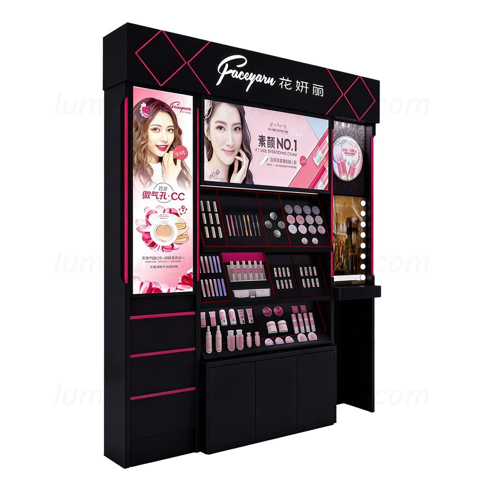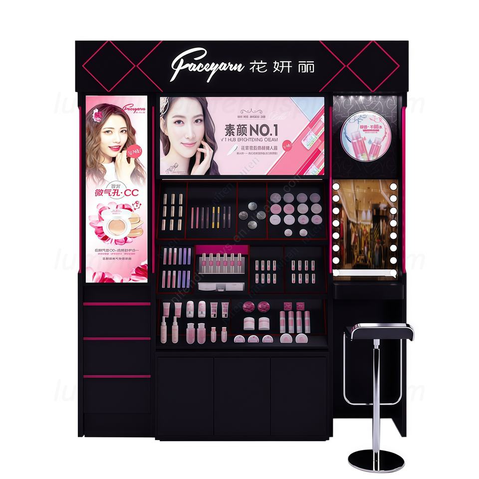 Vitrine de présentation tout-en-un en bois avec éclairage LED, panneau publicitaire, miroir de maquillage et tiroirs pour stand de cosmétiques de vente au détail