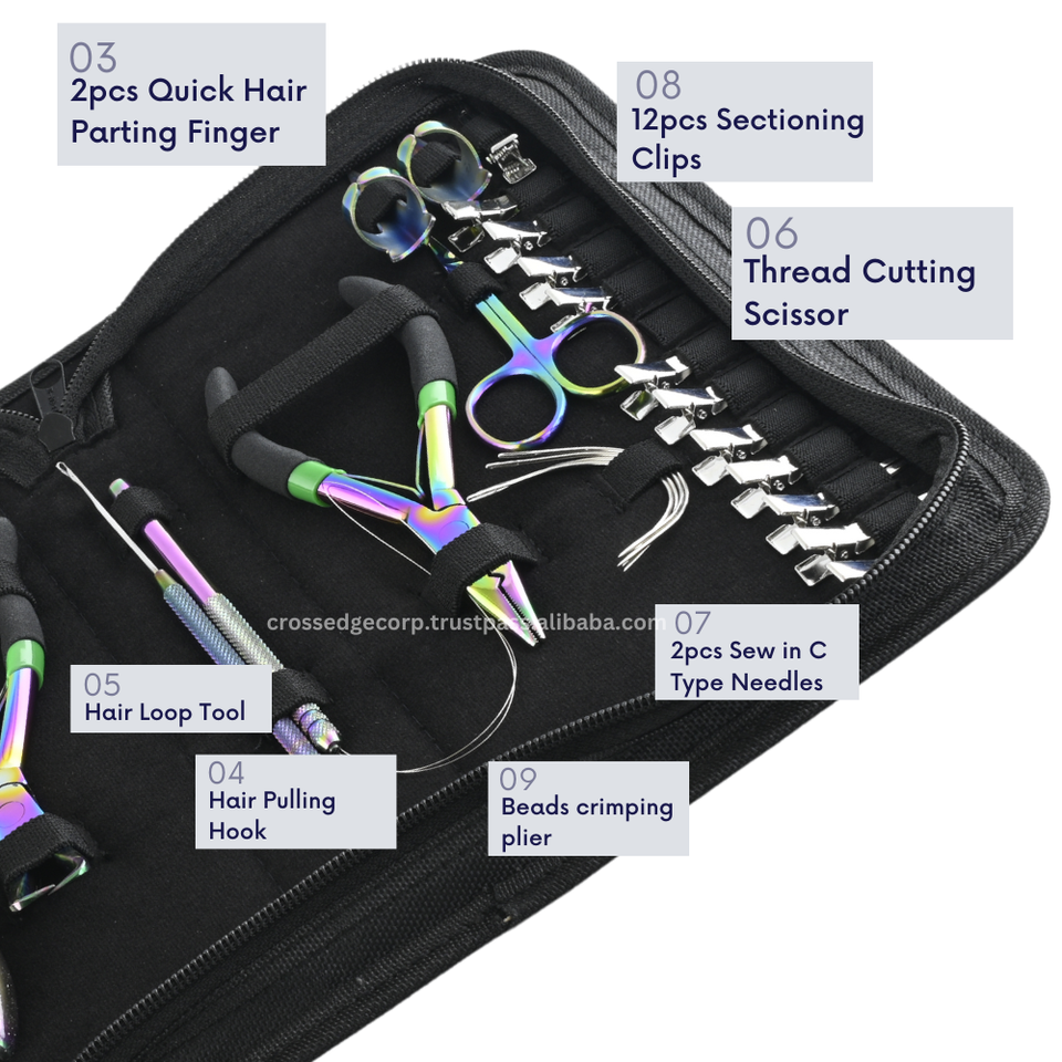 La trousse à outils tout-en-un comprend des pinces à coiffer et des anneaux de séparation, ainsi que des pinces à sertir et à enlever les microbilles au prix de gros
