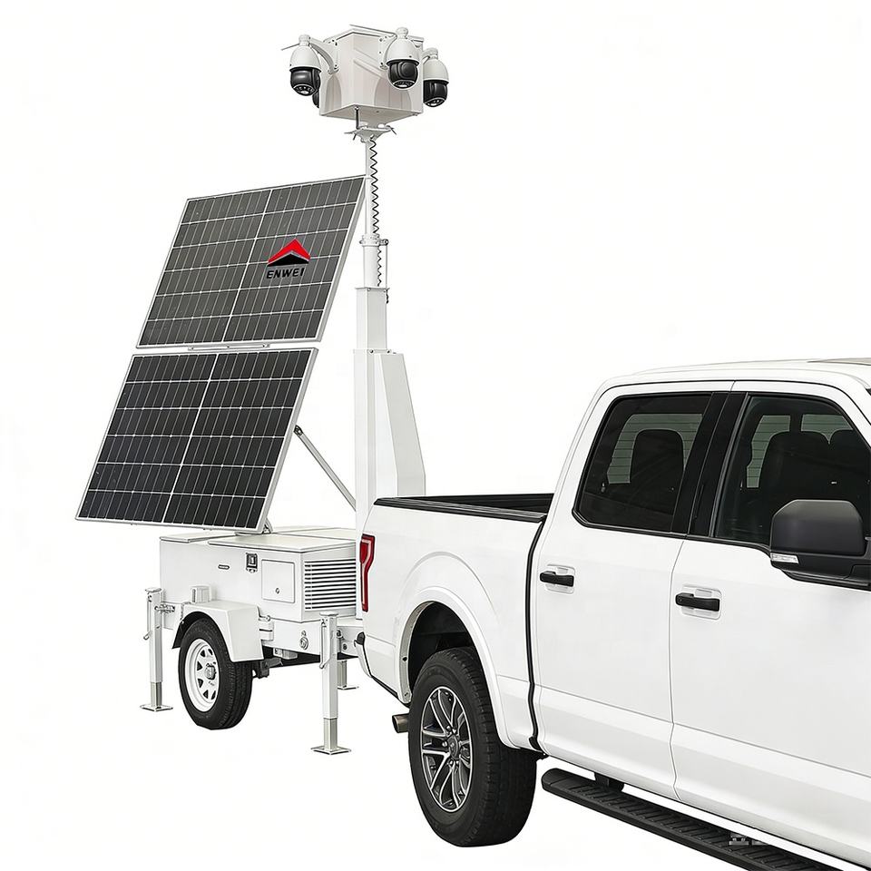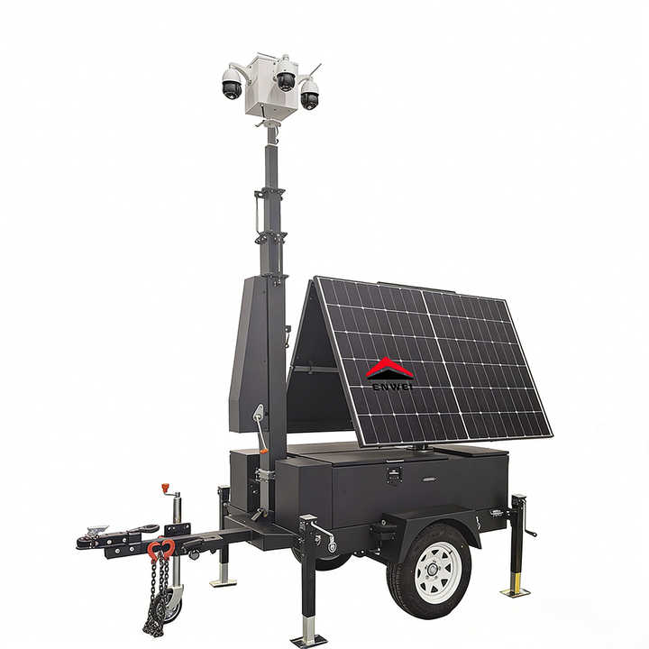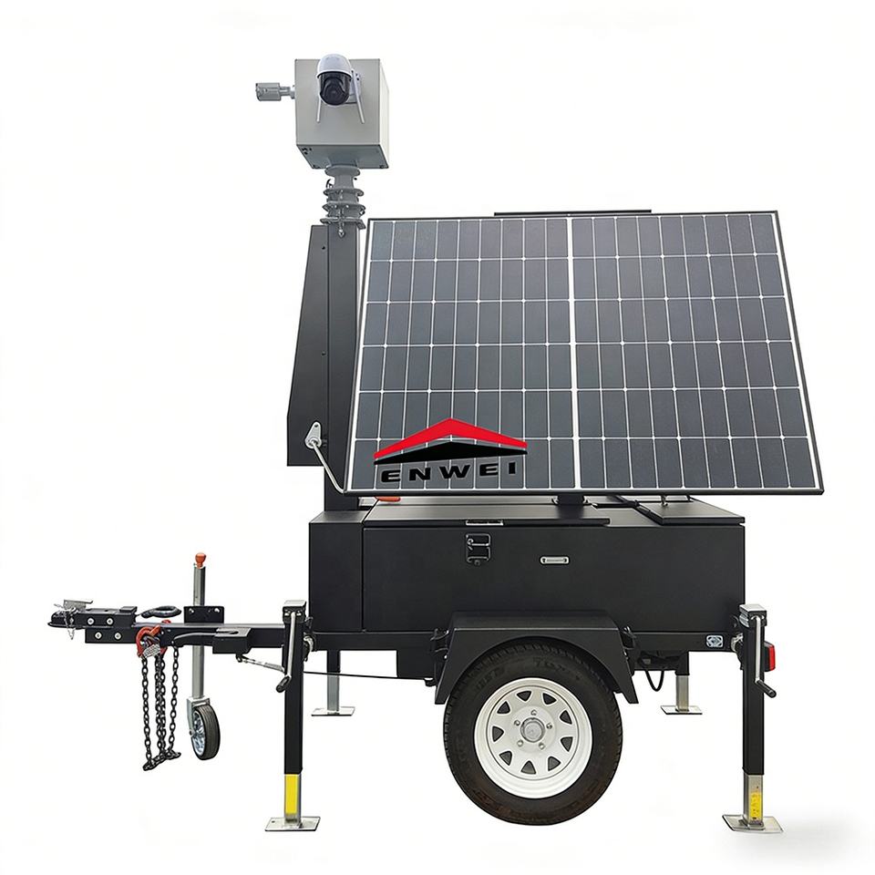 Remorques solaires toutes saisons avec caméra, remorque CCTV solaire pliable pour travaux de génie civil et de construction sur le terrain