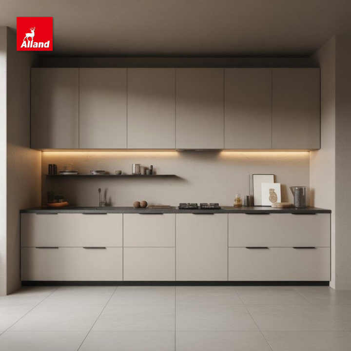 Cuisine modulaire en verre moderne Alland 2025, nouveau design, couleur beige, modèle complet