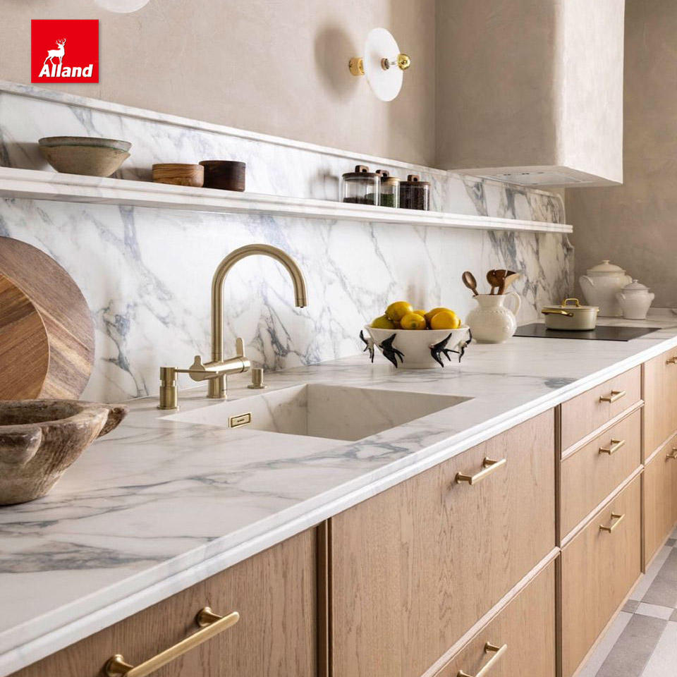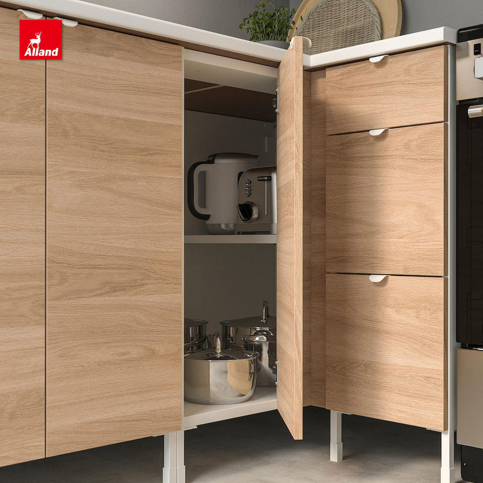 Armoires de cuisine en bois plaqué Alland de qualité supérieure, design moderne, demi-bullnose, avec robinet en résine pour salle à manger