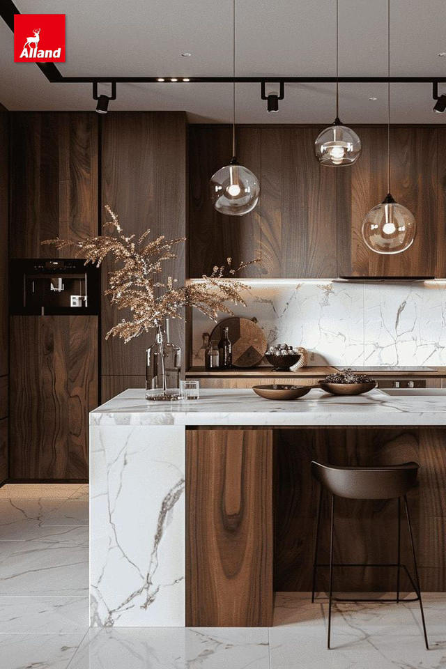 Îlot de cuisine moderne Alland avec portes texturées modulaires, couleur bois noyer foncé, en kit, et plan de travail en pierre frittée noire