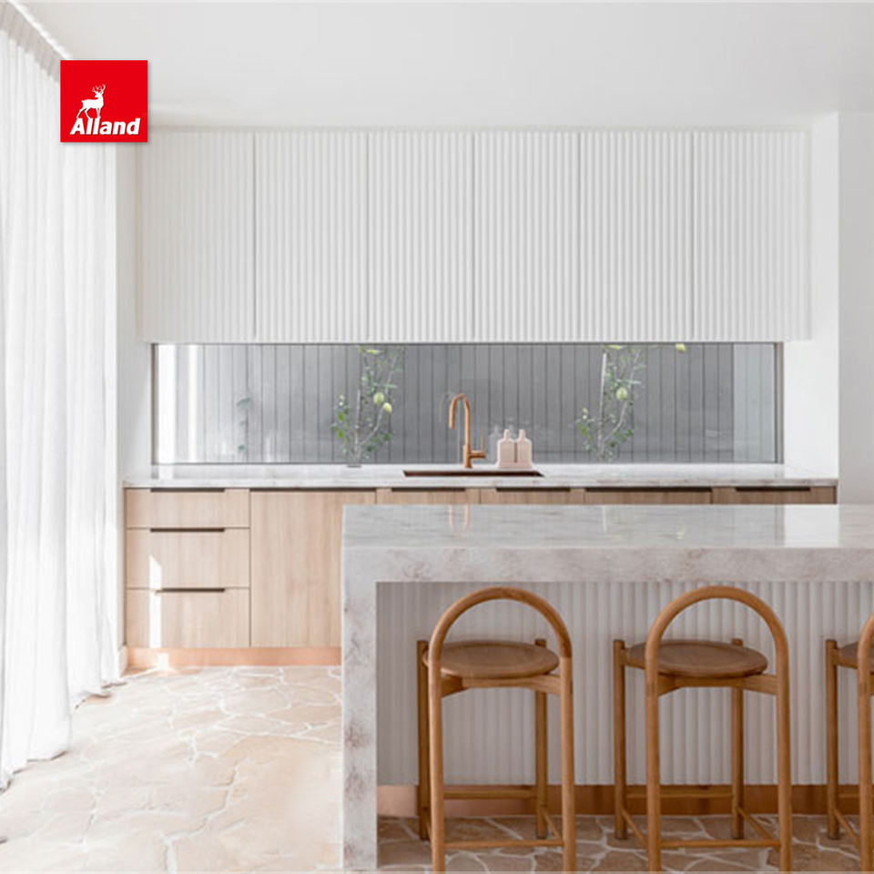 Porte à panneau perlé cannelé en bois massif d'Alland Armoires de cuisine intelligentes peintes en blanc et îlot avec armoire à base de grain de bois