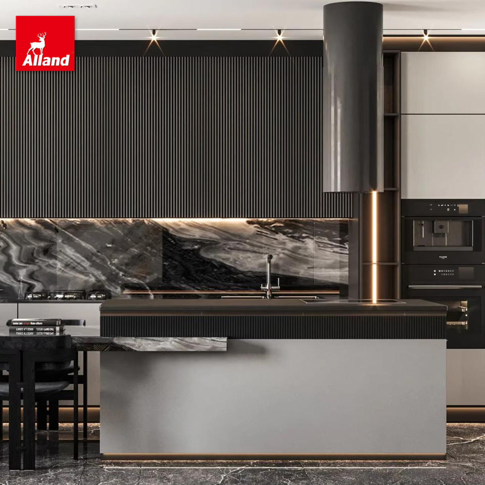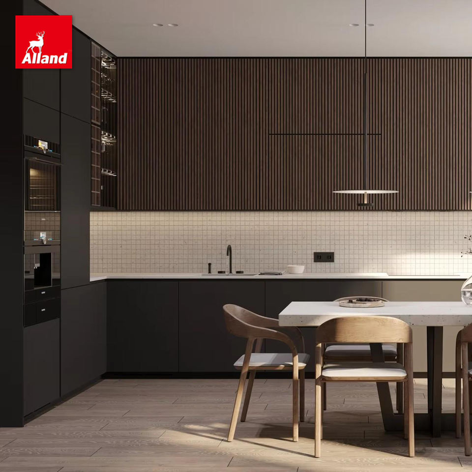 Portes de placard de cuisine AllandCabinet à panneaux cannelés pour un design minimaliste moderne avec porte en verre vitré et éclairage sous le placard