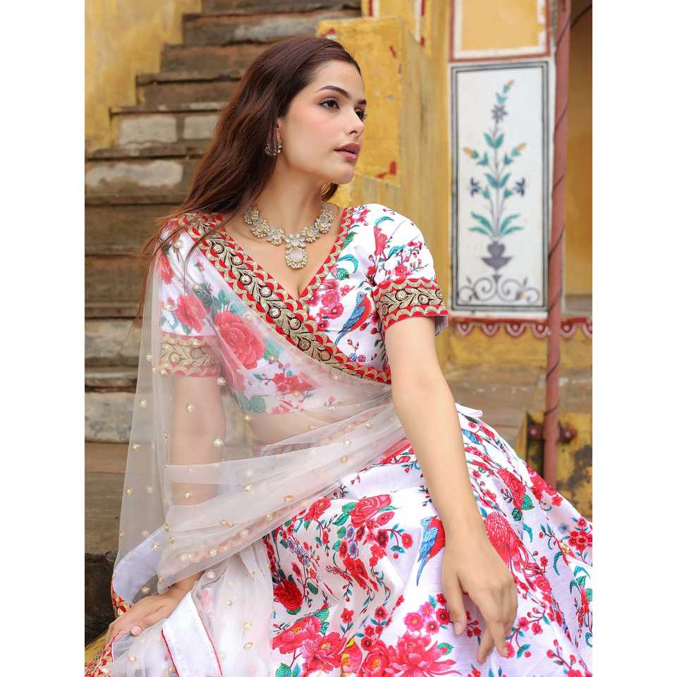 Alluring Off-White Floral Printed Art Silk Sangeet Wear Lehenga Choli