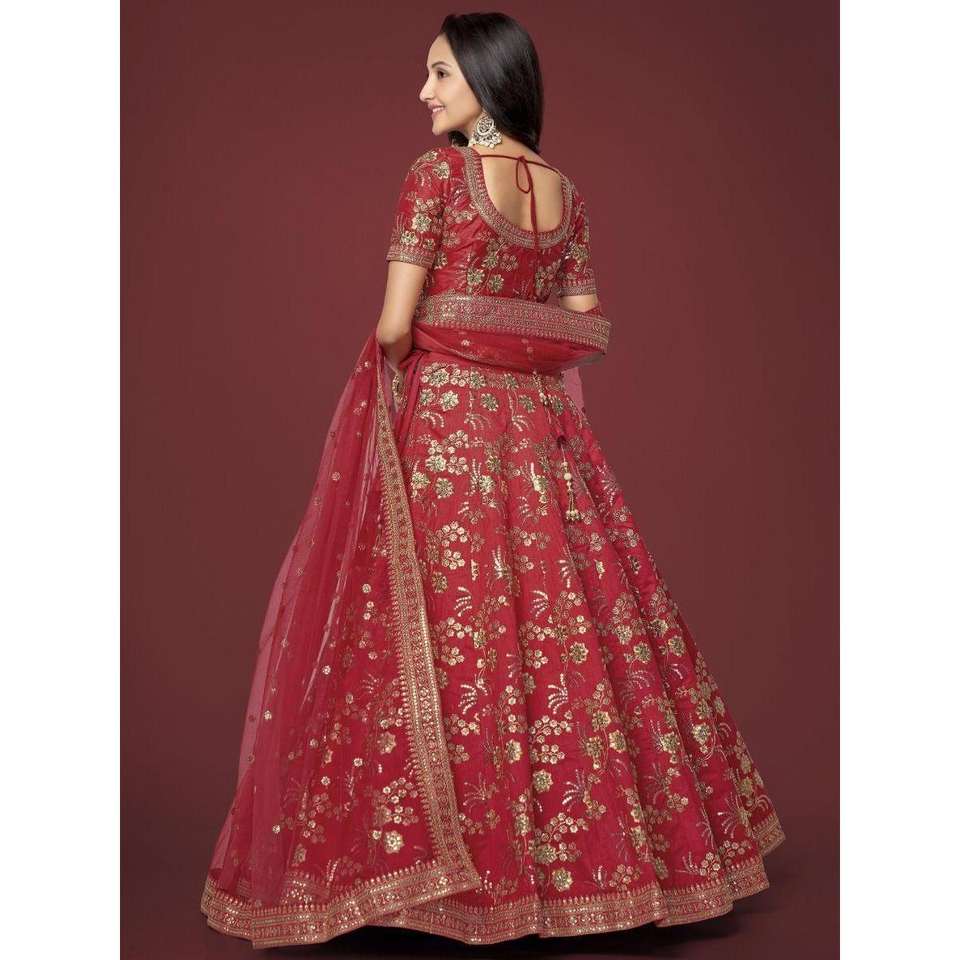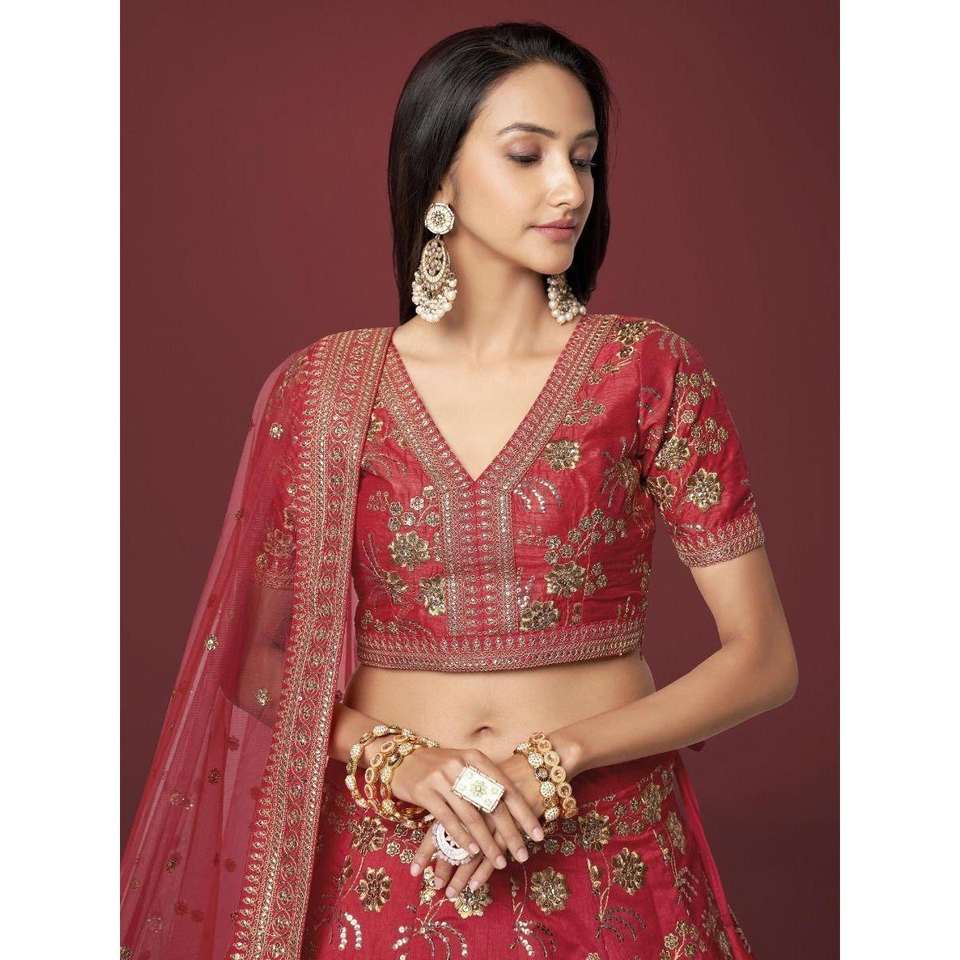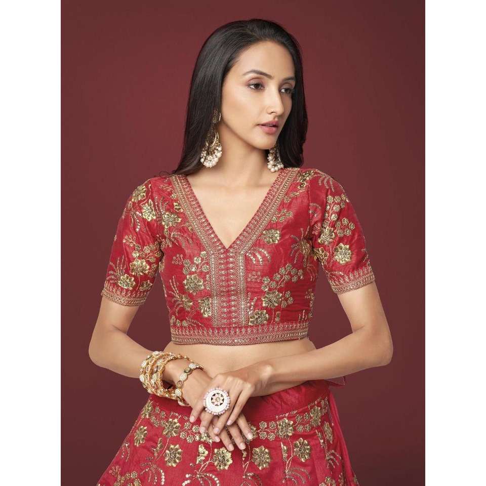 Séduisante soie brodée rouge traditionnelle Lehenga Choli avec chemisier
