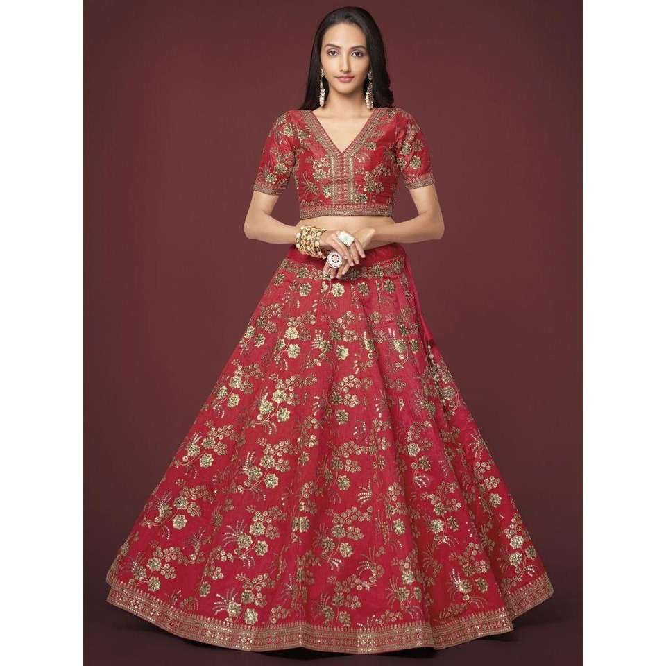 Séduisante soie brodée rouge traditionnelle Lehenga Choli avec chemisier