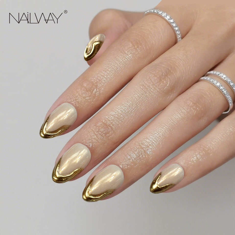 Faux ongles en amande moyenne, style français, avec bande dorée 3D, réutilisables, couvrant entièrement l'ongle, à coller, pour femmes, usage quotidien